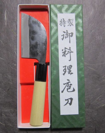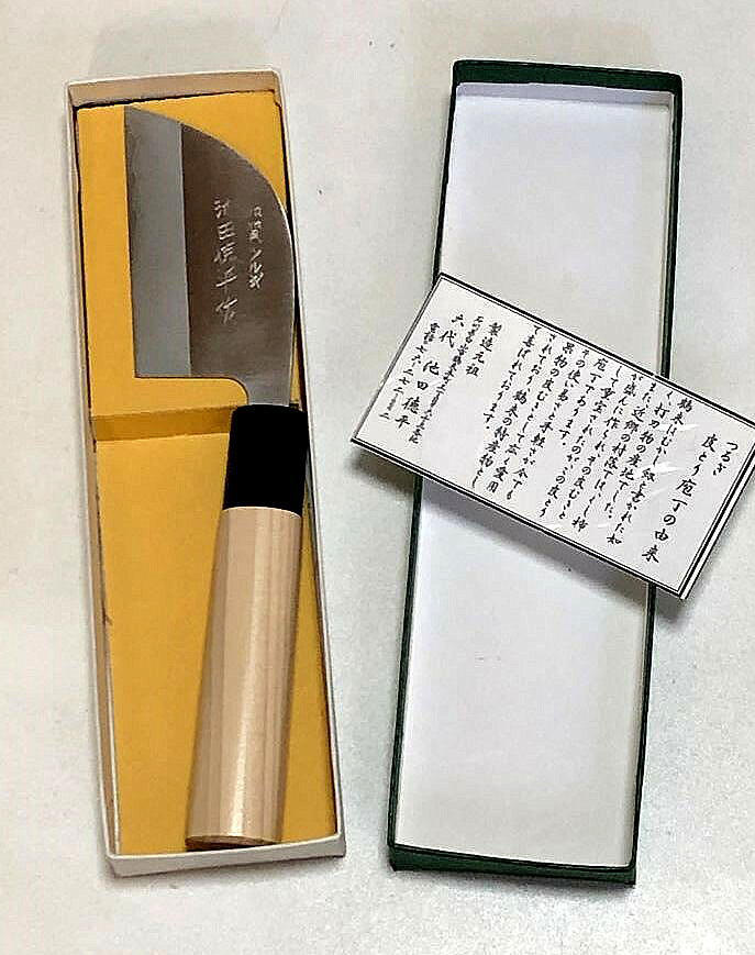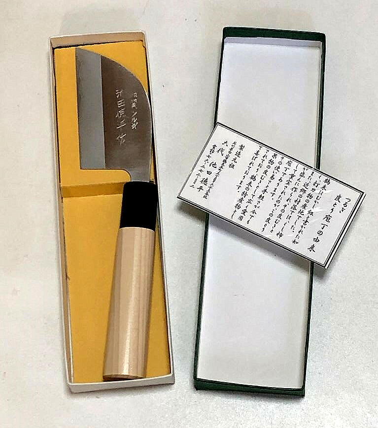 私は父にこれは何かと聞くと、戦後間もない頃まで、この辺りではよく使われたもので、のこぎり製作を主流での合間に当家で作っていた「 かわとり包丁 」の柄だとの事。私は想像もつかず、どんなものか父に作ってもらいました。偶然にその頃私は地元でボーイスカウトの指導をしていた関係でお尽きあいしていた県のコミッショナーをしていた金沢のお寺のご住職さんのお宅へお伺いしたおりに、ご馳走になったリンゴの皮をむくときに戦争中からまだ使っているという、さすがに研ぎ込まれかなり細くなった「かわとり包丁」を目にしました。柄はご自分で布(きれ)と漆を幾重にも重ねて貼ったというツヤの良い柄が入っていました。